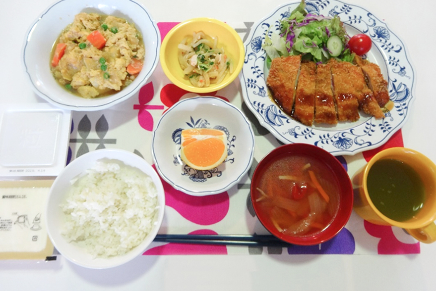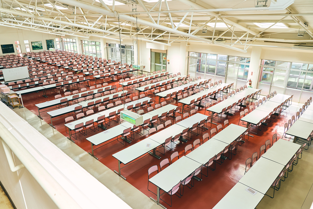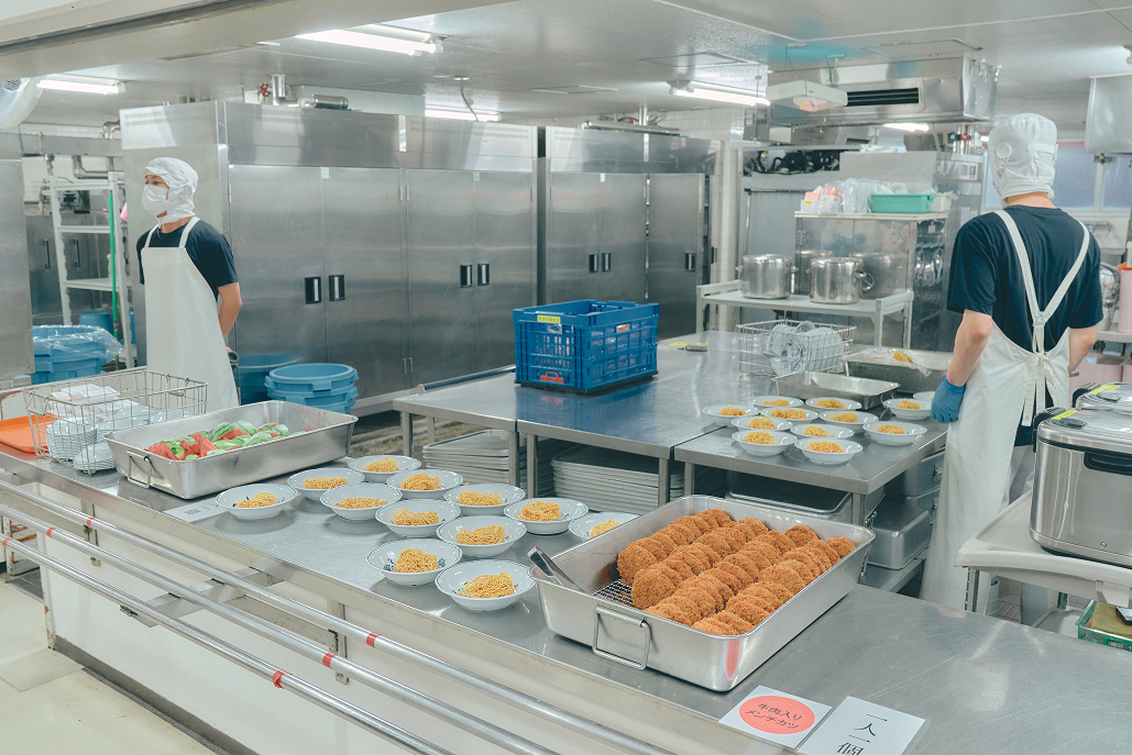 寮生全員が食堂で朝食、昼食(給食)、夕食をとります。朝夕食はビュッフェ形式で、管理栄養士の指導のもと、栄養バランスのよいメニューとなっております。友人と和気あいあい、一日の出来事を共有しながら楽しい時間を過ごします。