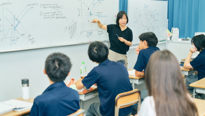 The IB course is suited for those who aim for admission to both Japanese universities and universities worldwide. In the IB course, Senior 1 students can take many subjects in both Japanese and English. From Senior 2, they may take all subjects in English. Therefore, even non-native speakers of Japanese can earn credits in English.