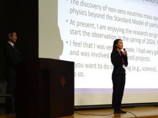 講演内容として、梶田先生のスーパーカミオカンデによる研究や、ニュートリノ振動、ニュートリノが質量を持つ意義や発見までのご研究内容等についてご説明頂きました。
