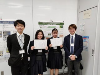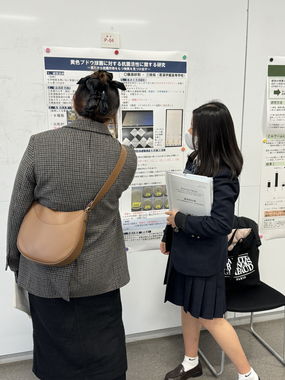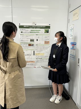 当日は企業の研究者や大学生の方々と一緒になって、飯島さん、専称さんの両名が1年間、意欲的に取り組んだ「個人課題研究」の成果についてポスター発表し、専門家の先生方よりそれぞれの研究内容について貴重なご助言を頂き、通常の研究発表では得られないとても有意義な時間を過ごすことができました。