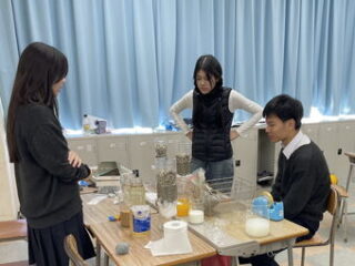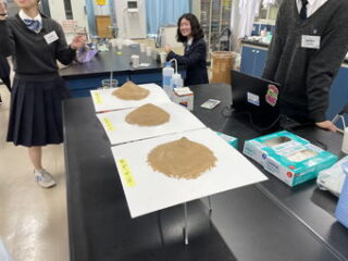 今回のテーマは生徒たちと話し合い、「災害」に決定。4人程度のグループに分かれ、テーマに基づいて実験内容を企画しました。例えば、ある班は液状化現象に注目し、水の量が液状化現象に与える影響をデータで分析しました。他の班は火山活動や耐震構造をテーマに実験を行うなど、多様な視点から災害を探究しました。