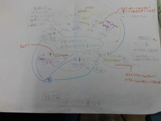 同じ興味関心を持つメンバーがクラスの枠を超えてグループを作り、探究活動を行っています。グループ内では、現実的で実現可能な「問い」を立てました。例えば、「海外から見た日本はどのように見えるのか」や「中国は地方によって料理の味つけが異なるのか」などです。「問い」を用紙の中心に書き、その「問い」の答えを導き出す方向性を書いています。