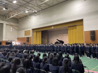 2月28日に「六年生を送る会」を実施しました。今年は中学1年生と2年生に加えて、高校2年生も学年合唱を披露しました。中学3年生、高校1年生、高校2年生の3つの学年は、芸術の授業で培ってきた技術を使ってそれぞれの形で卒業生を送り出しました。音楽選択者は合同合唱を披露し、書道選択者は自身で書いた書を卒業生のHR教室に展示しました。また、美術選択者は切り絵を用いて高校昇降口を装飾しました。体操部やダンス部、吹奏楽部、バンド団体のパフォーマンスも大いに会場を盛り上げました。『名探偵コナン』を題材にした教員劇は、44回生の先生方のカラーと生徒を愛する気持ちに溢れた舞台となり、生徒たちは大喜びでした。