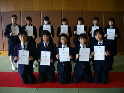 今回は、1級に多賀陽平君、 2級に高橋慧さん、内窪咲月さん、左津前花音さんが合格し、3級にも多数の中学2年生が合格致しました。