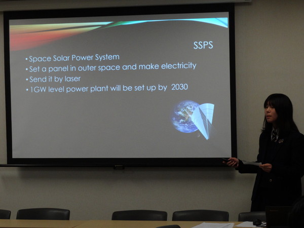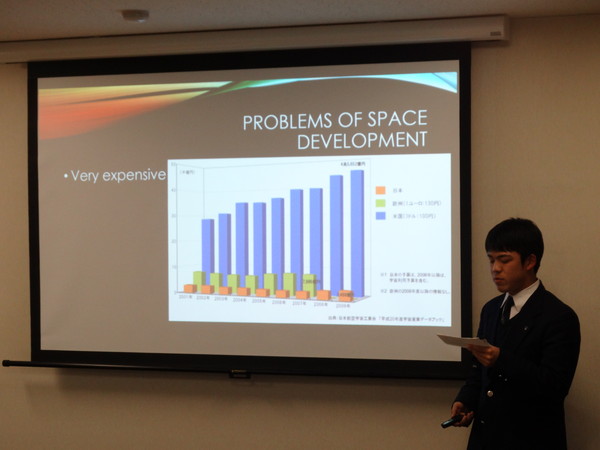 茗溪学園から参加した高校2年 八戸琢磨君、島野史子さんは、「Space and Engineering」というテーマで発表、今年1月上旬に参加したSSH米国海外研修での宇宙工学・医学で学んだことを盛り込みながら、宇宙を利用した科学技術の将来と可能性についてプレゼンテーションを行いました。