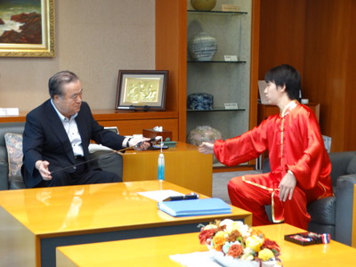佐藤君・山口さんは橋本知事に、JOCジュニアオリンピックでの優勝・入賞報告と併せて、昨年に引き続き、全日本武術太極拳選手権に茨城県代表として出場を報告、「全日本大会でもいい演武を見せたい」と意気込みを語りました。