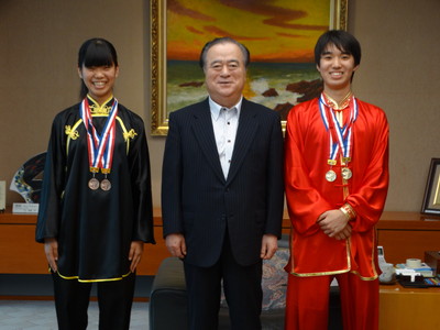 7月8日~10日開催「第33回全日本武術太極拳選手権大会」(東京体育館)の出場報告のため、高校2年生 佐藤龍之介君、山口智恵実さんが7月4日、茨城県庁に橋本昌茨城県知事を訪ね、全日本大会出場に向けた抱負を述べました。
