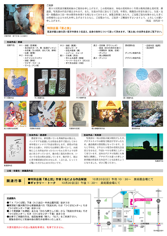 生徒作品だけでなく、保護者、卒業生、教職員の作品も展示し、生徒・父母・教職員の「三位一体の教育」を体現する場となっています。