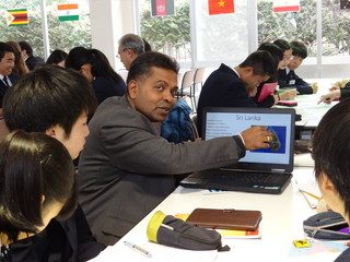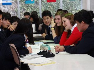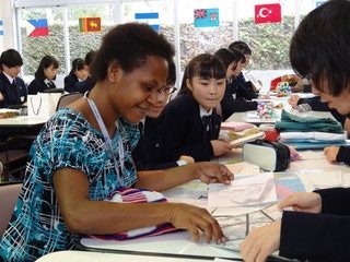 班ごとでの交流では、各国のゲストたちへ日本文化紹介等のプレゼンテーションを英語で行いました。また、ゲストからは母国についての紹介や生徒たちへ質問も行われ、それぞれのグループで活発に討論が進んでおりました。