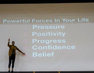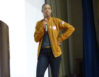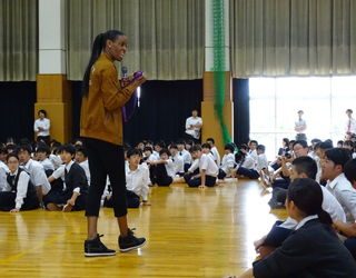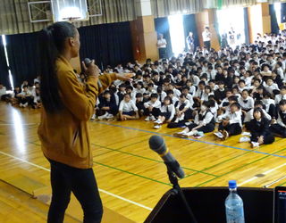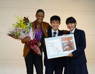 Dee Dee さんは、陸上競技400メートルの選手として2004年から3大会連続してオリンピックに出場しましたが、膝の怪我による影響で3年間、不遇な時期を経験しながらもその努力で見事に復活し、五輪メダルを獲得するまでのお話を披露してくれました。また、講演会では全校生徒に向けて、目標に向かって諦めずに挑戦し続けていくことの大切さを、ご自身の経験をもとに熱く語ってくださいました。