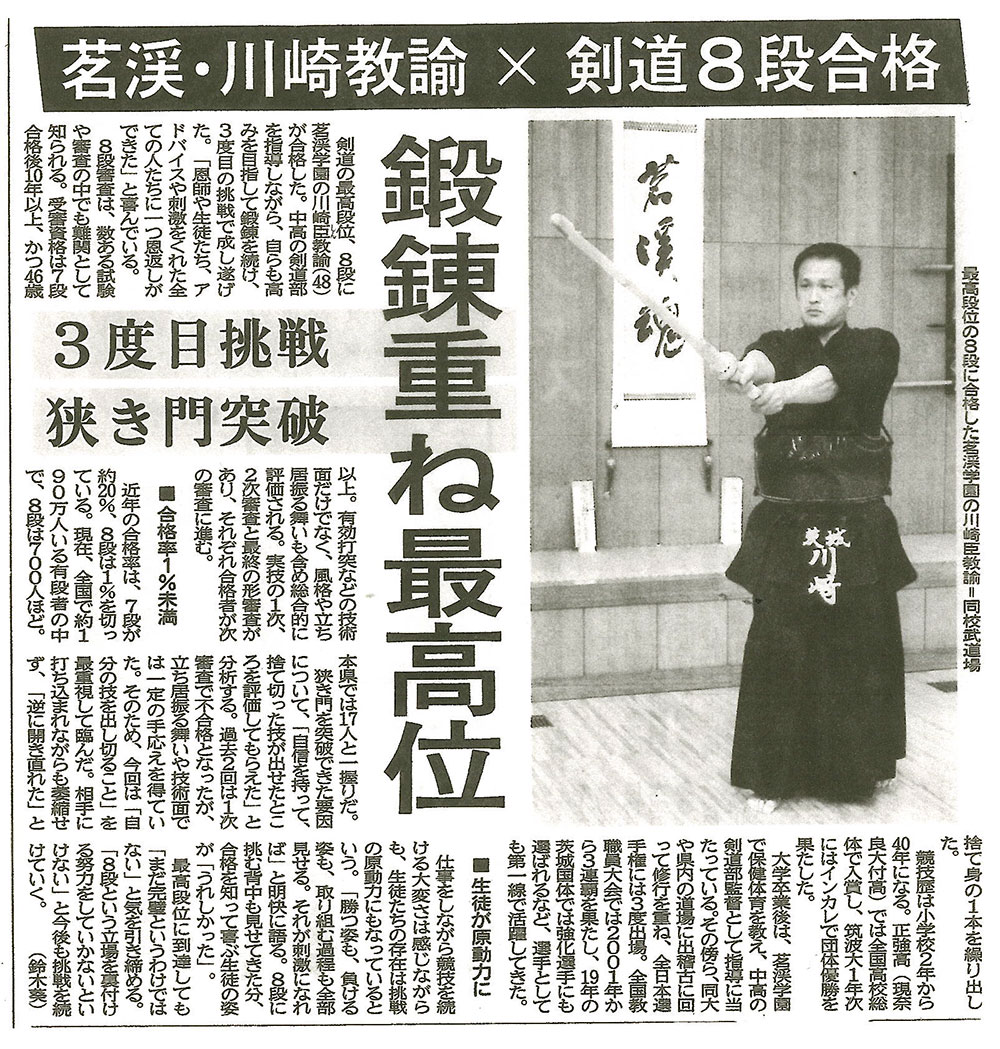 体育科 川崎教諭 剣道8段合格の記事が新聞掲載されました