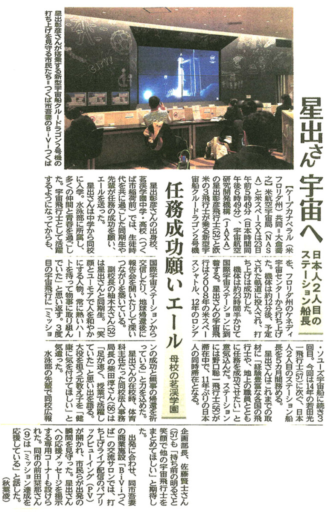 今回は新型コロナウィルス感染予防の観点から、学校でのパブリックビューイング等のイベントは実施しませんでしたが、星出さんが本校に在籍していた当時の教員や同期生、関係者等のコメントが、24日の朝日新聞朝刊、茨城新聞朝刊に掲載されました。
