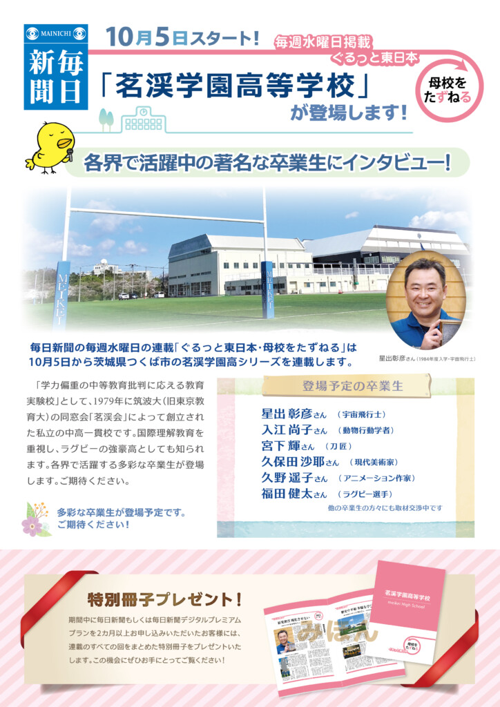 毎日新聞朝刊に毎週水曜日掲載中の「ぐるっと東日本・母校をたずねる」に、10月から2カ月間、「茗溪学園高校編」が連載、特集されることになりましたので、お知らせ致します。