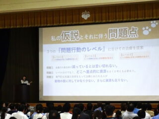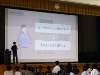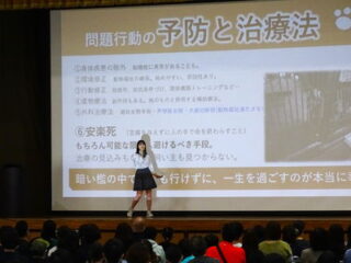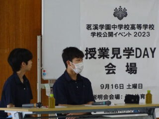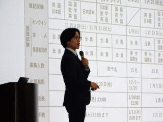 学園説明会では、AC・MGクラスにそれぞれ所属する中学3年生2名による学校説明、高校3年生の「個人課題研究」説明と研究成果発表を行い、最後に入試担当から来年度中高入試について説明させて頂きました。