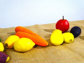 本物の野菜を観察して粘土で制作しました。着彩には、アクリルガッシュを使用しています。