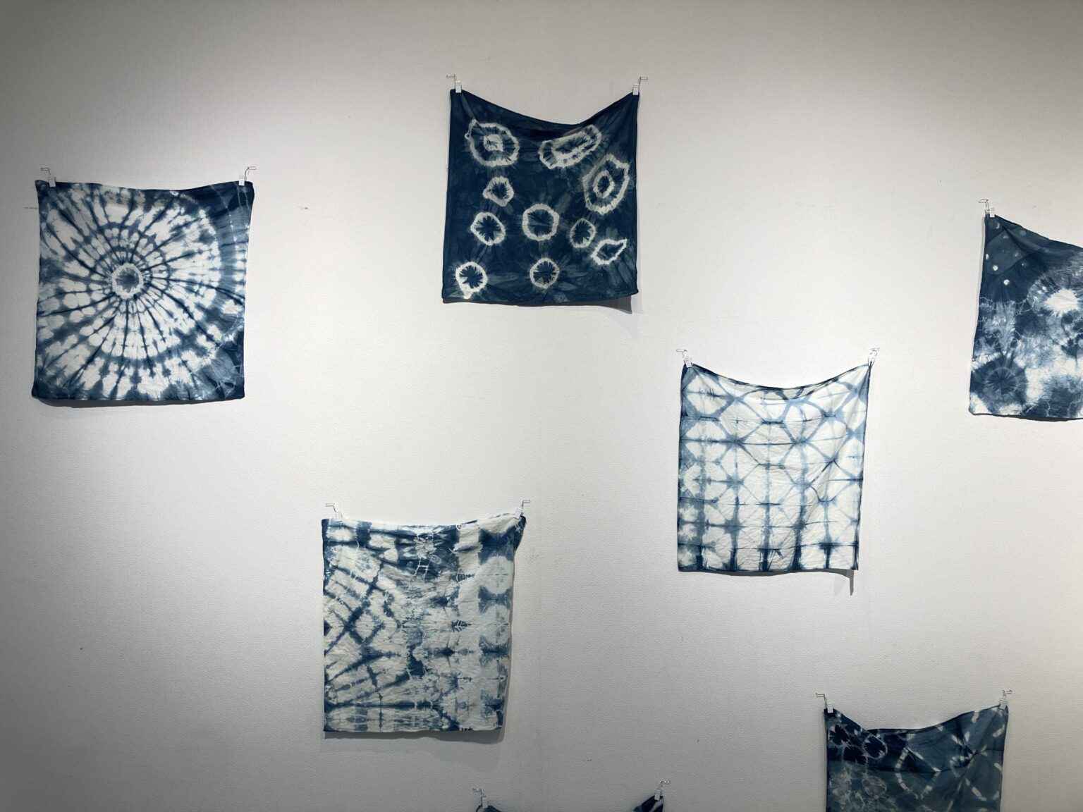 9月14日に行われた公開授業にて3年EF組が制作した特別課題の作品です。輪ゴムやビー玉などで布を縛って、大和藍で染色をしました。