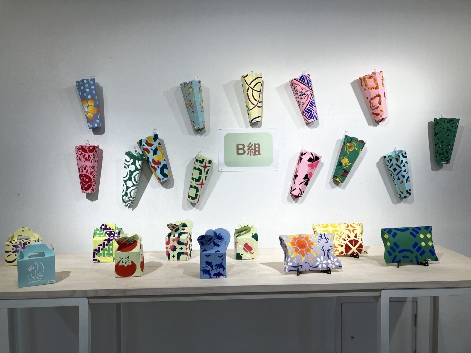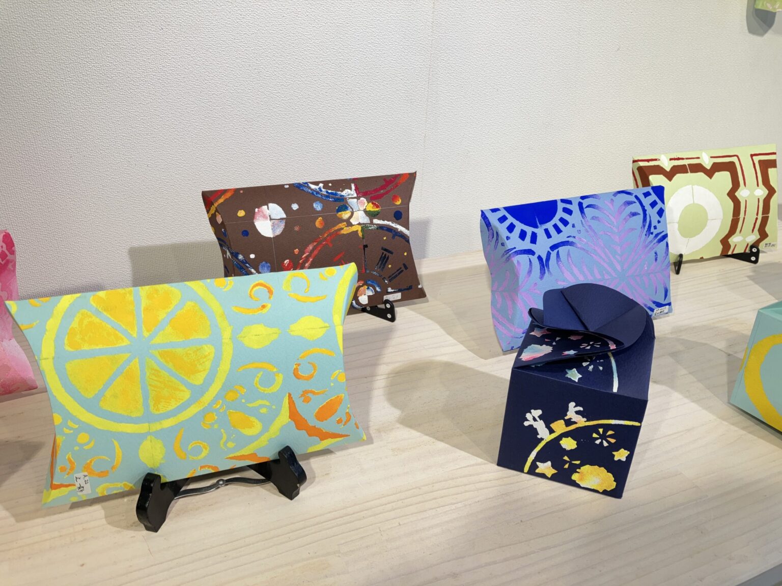 ステンシルの技法で繰り返しの模様を作り、箱の形に仕上げました。