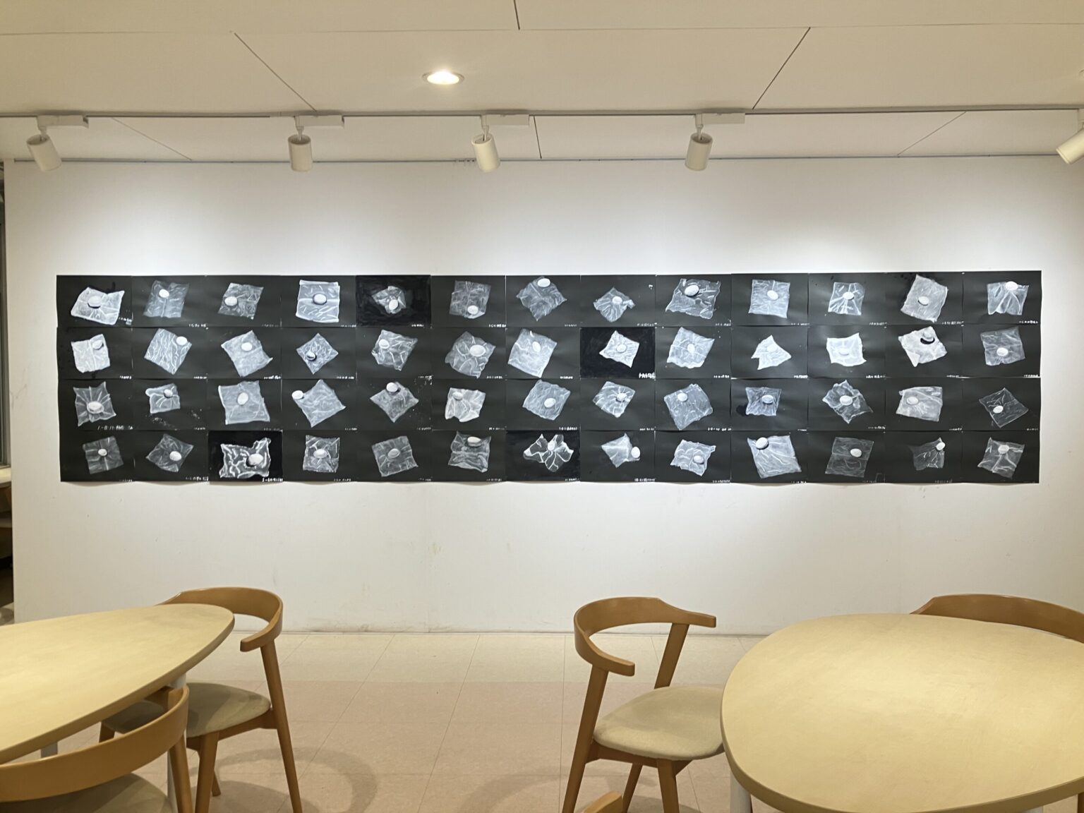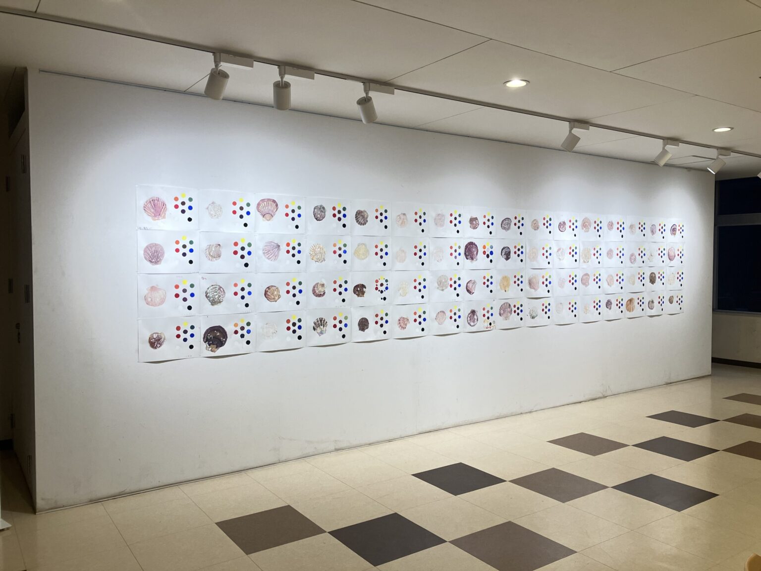 アートギャラリーB:「50回生(中1)ちりがみ・たまご、三原色で描くホタテ貝」