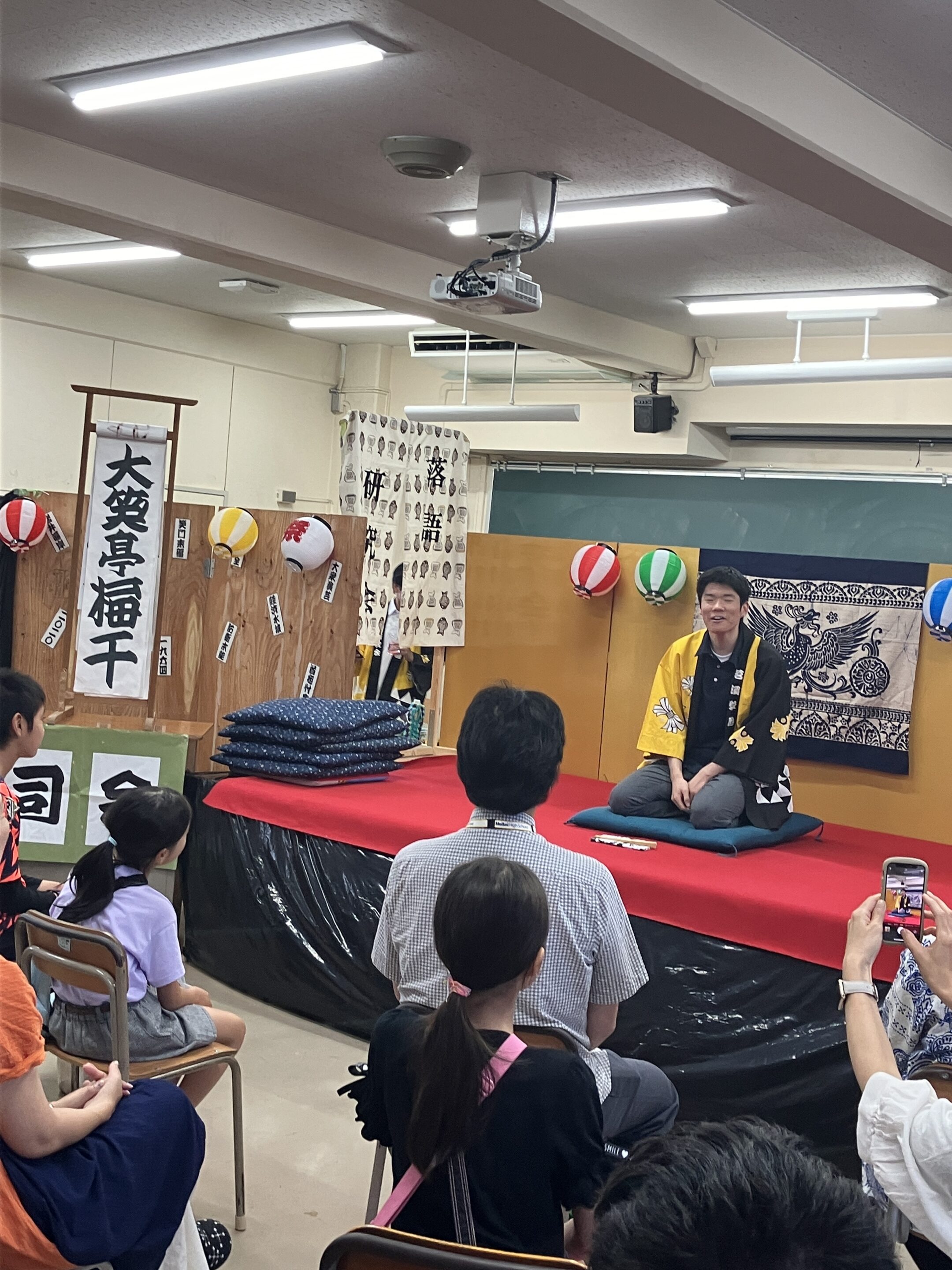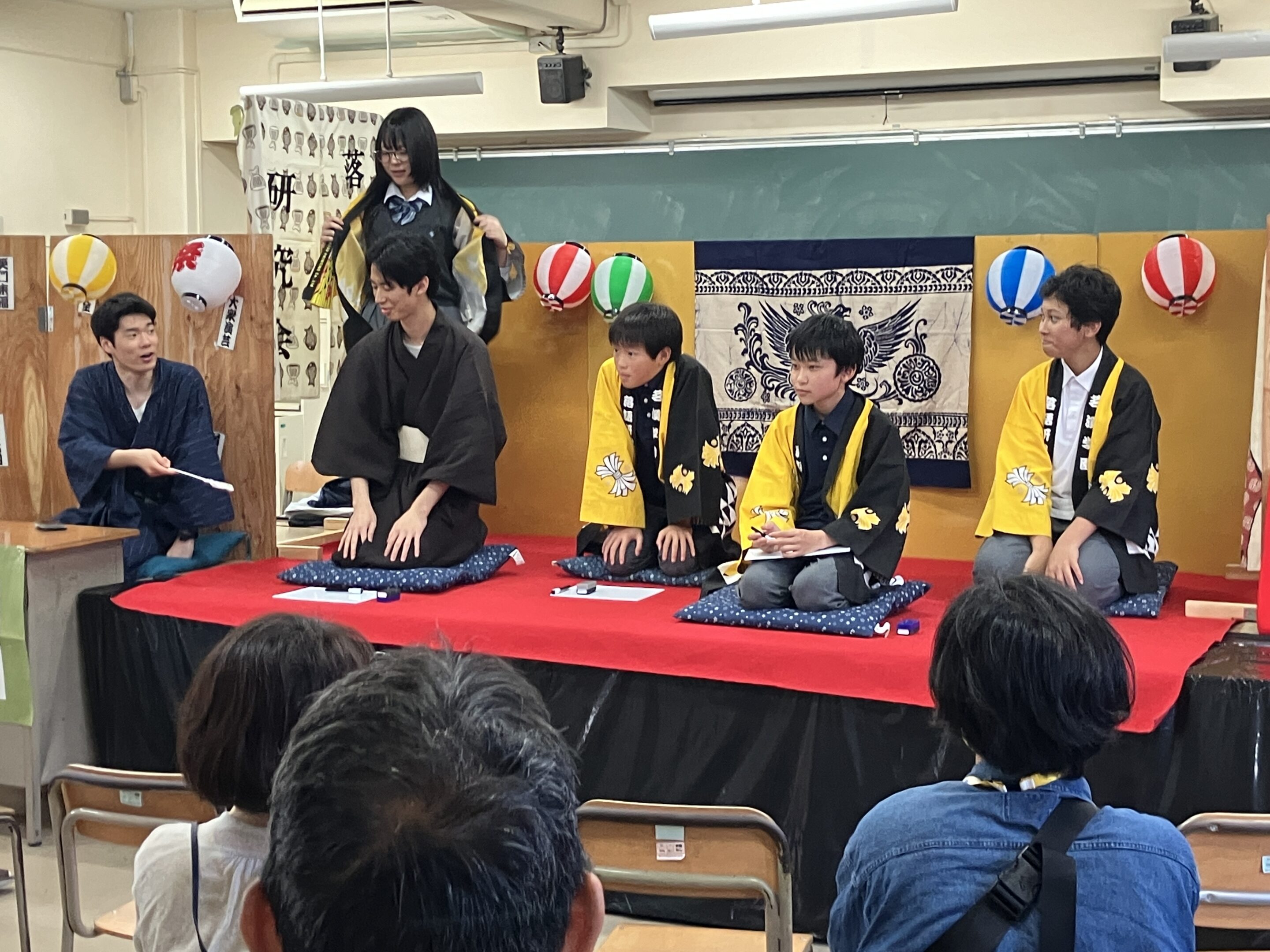 落語研究会(略称「おちけん」)です。定例の活動としては週3回ですが、発表会の前には活動回数がもう少しだけ多くなります。主な発表の場は桐創祭、校内寄席、そして子ども食堂などでの外部発表会です。落語は茗溪生よりもご年配の方やお子さんに特にウケがよいので、桐創祭での発表は毎回満席でものすごく盛り上がります。最近では出囃子の三味線を生で弾く会員もいます。もちろん大喜利も行います。年に1度は東京の寄席に繰り出してプロの芸を鑑賞するツアーも行い、自分の芸を磨くヒントにしています。
