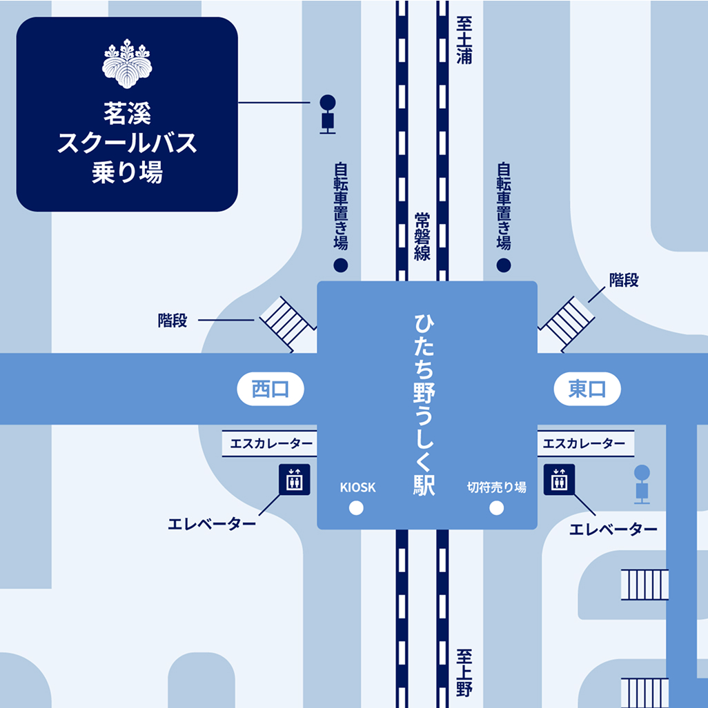 JR上野駅から常磐線で1時間、ひたち野うしく駅で下車し、西口に降ります。西口前からタクシーで約10分で茗溪学園に着きます。東口に降りてバス停から「つくばセンタービル」行きの路線バスで約15分、「環境研究所」で下車し徒歩約5分です。