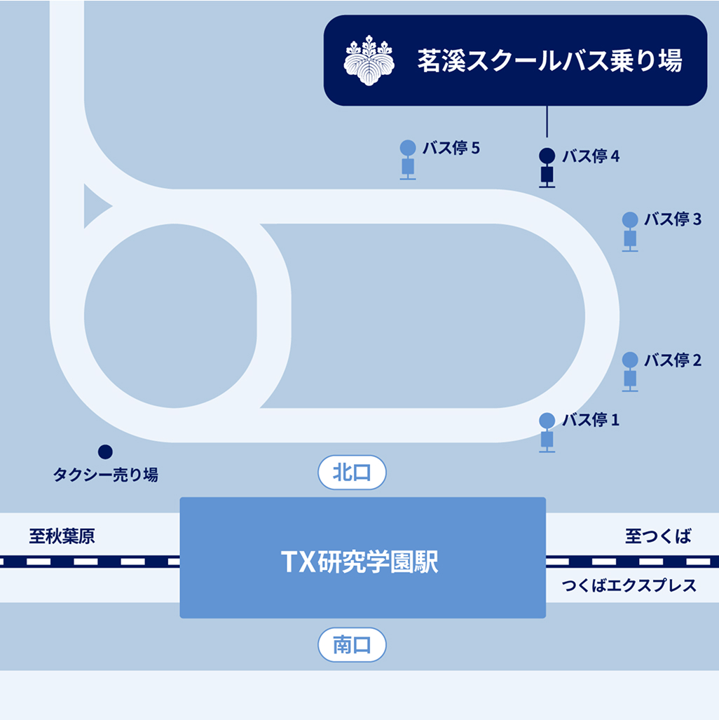 TX秋葉原駅から45分、終点つくば駅で下車し、タクシーで約10分で茗溪学園に着きます。つくば駅バス停(TXセンタービルバス停)から「ひたち野うしく駅」行き(他)で約15分、「環境研究所」で下車、徒歩約5分です。