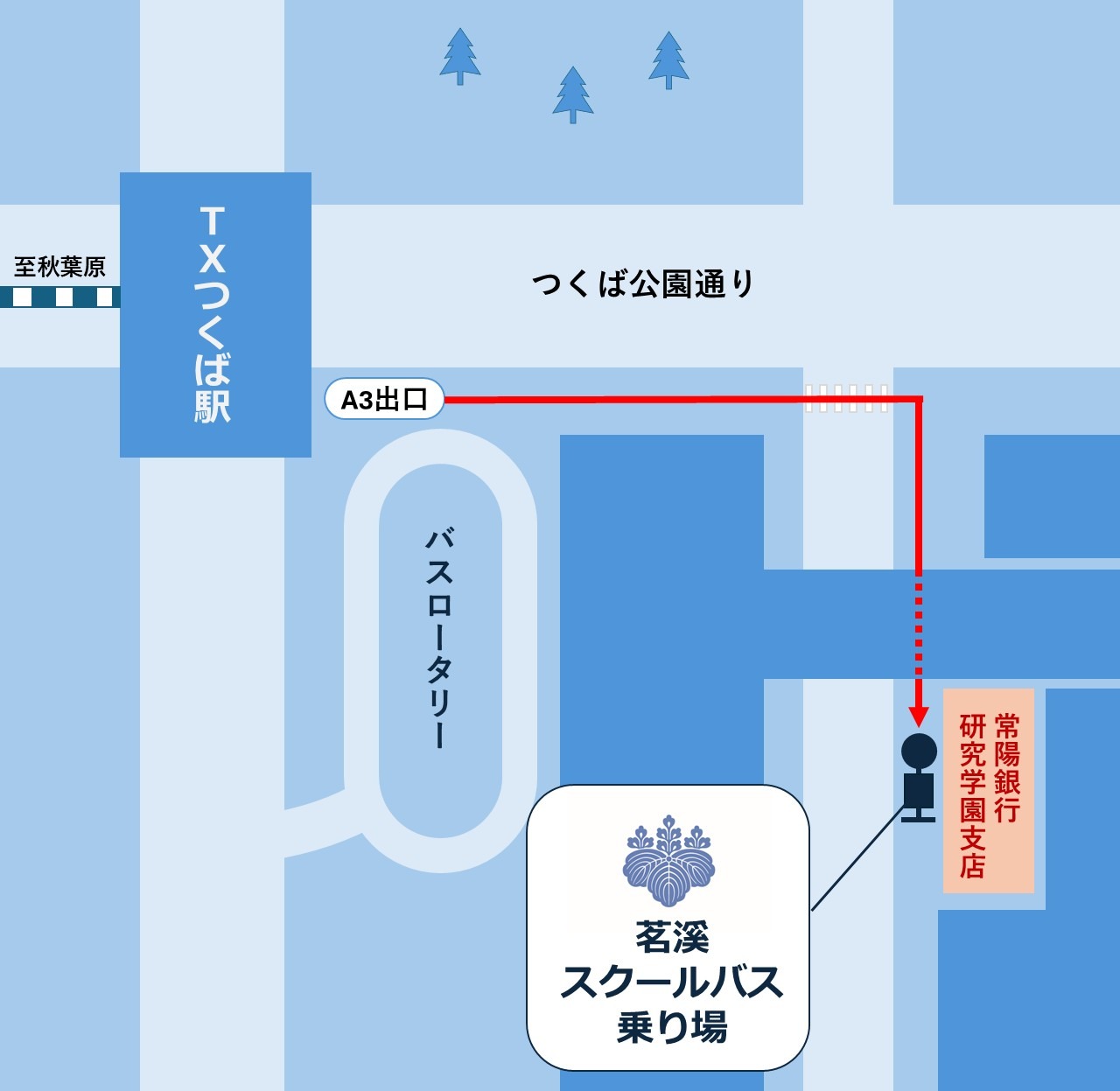 ※TXつくば駅のバス乗降場所は常陽銀行研究学園都市支店前です。