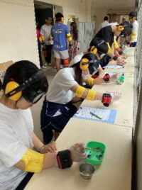 高齢者体験では、視覚や聴覚に制限がある状態を想定し、足に重りを付けて校舎内を歩き回りました。体験後には、どのような工夫をすれば高齢者の方々がより安心して暮らせるのかについて、生徒同士で意見交換を行いました。